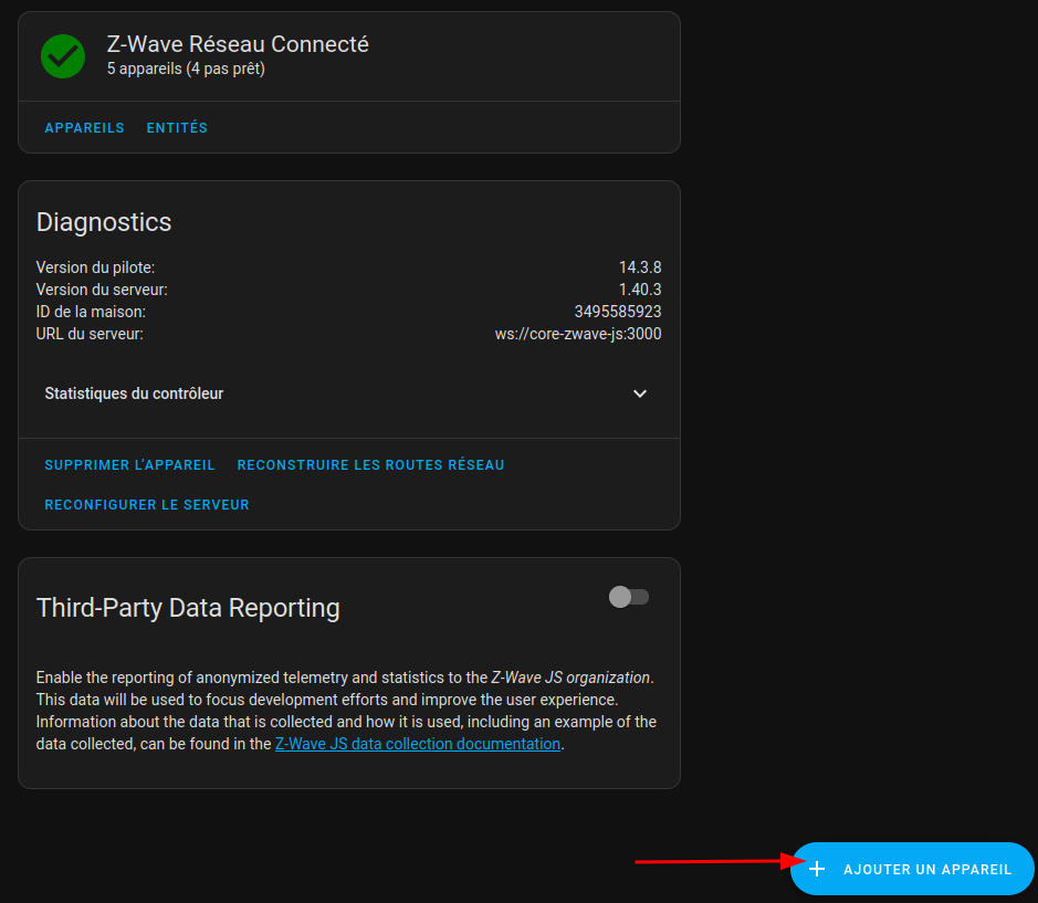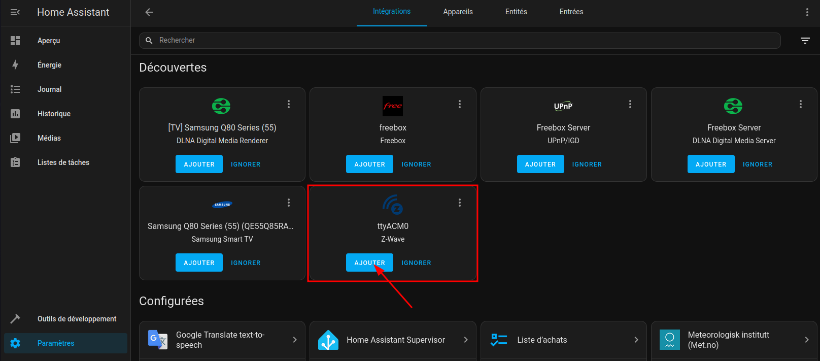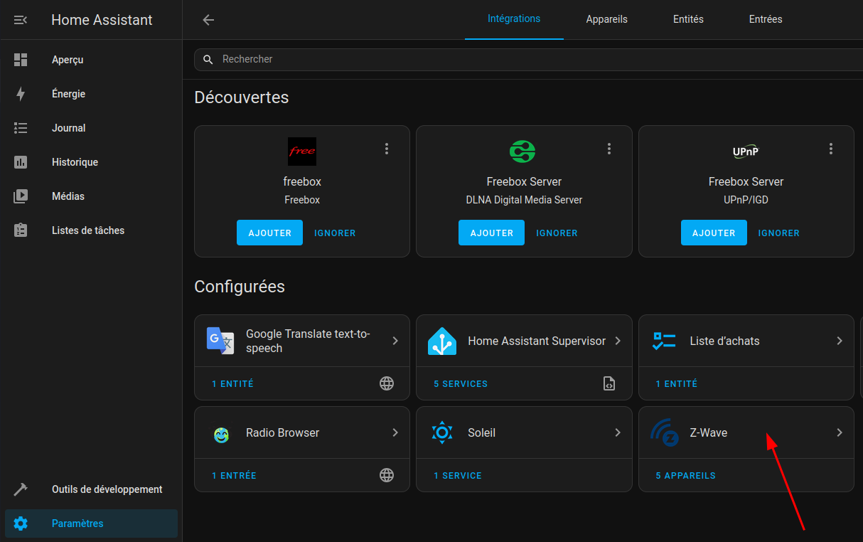 Pour inclure l’appareil dans Home Assistant, rendez-vous dans le panneau de contrôle Z-Wave : Paramètres –> Appareils et services et cliquez sur la tuile Z-Wave