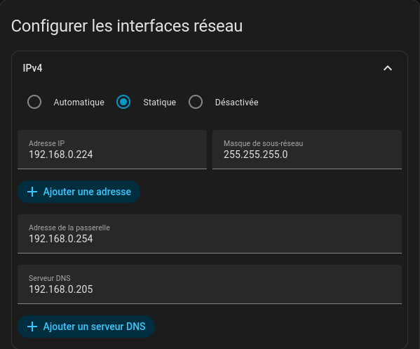 - Définir IP, la passerelle et DNS