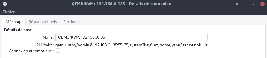 virt-manager -c 'qemu+ssh://admin@192.168.0.135:55135/system?keyfile=/home/yann/.ssh/yunobulls'