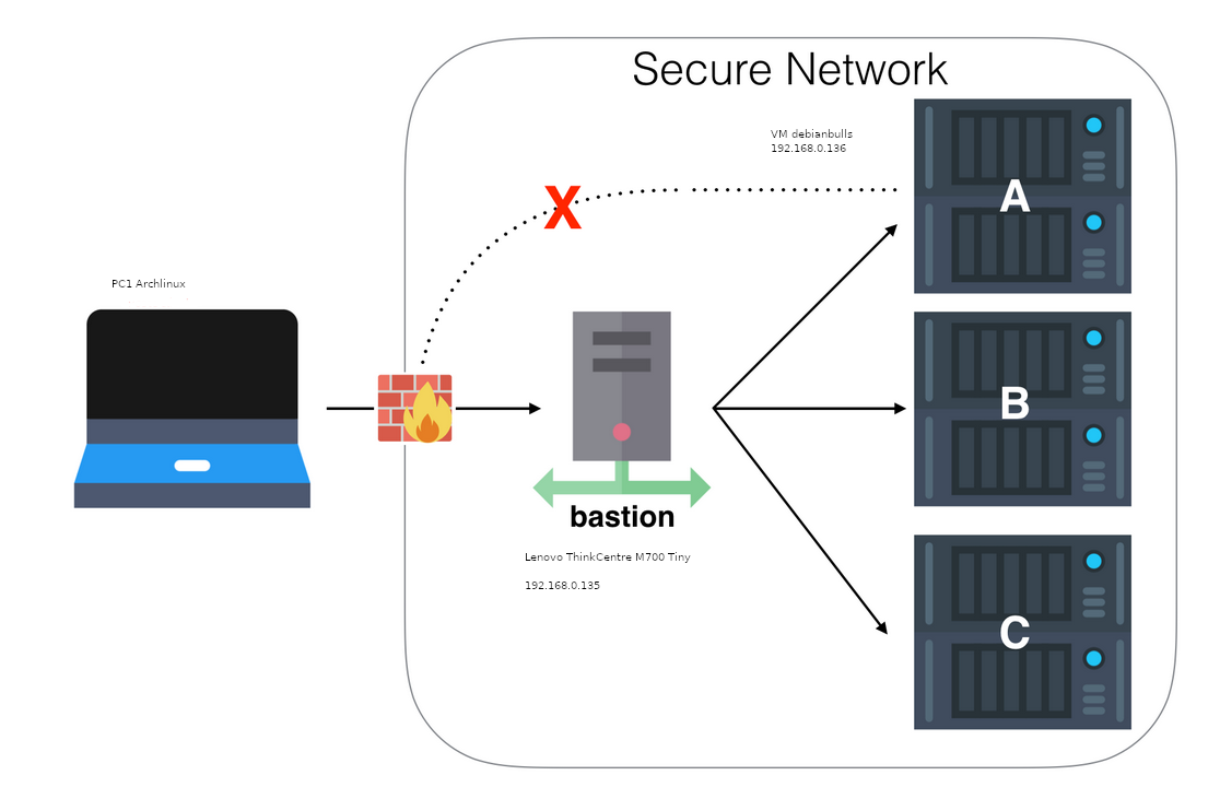 Poste PC1 Archlinux –> Bastion Lenovo ThinkCentre 192.168.0.135 –> VM debianbulls 192.168.0.136