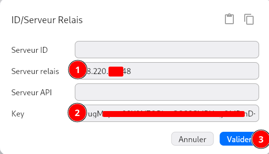 Pour que le client Rustdesk puisse utiliser le relais, il faut lui donner 2 choses :