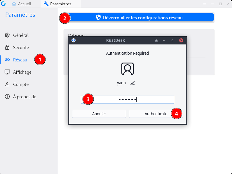 Une fois que les deux postes ont installé RustDesk (télécharger ici : https://github.com/rustdesk/rustdesk/releases), il faut le configurer pour rediriger le trafic vers une instance autohébergée