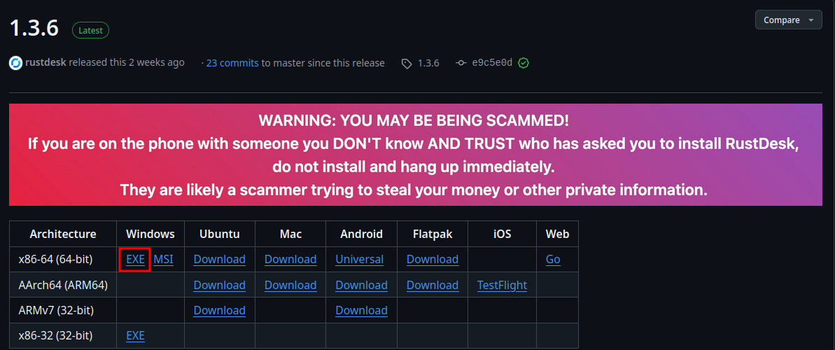 Page de téléchargement application Rustdesk https://github.com/rustdesk/rustdesk/releases/