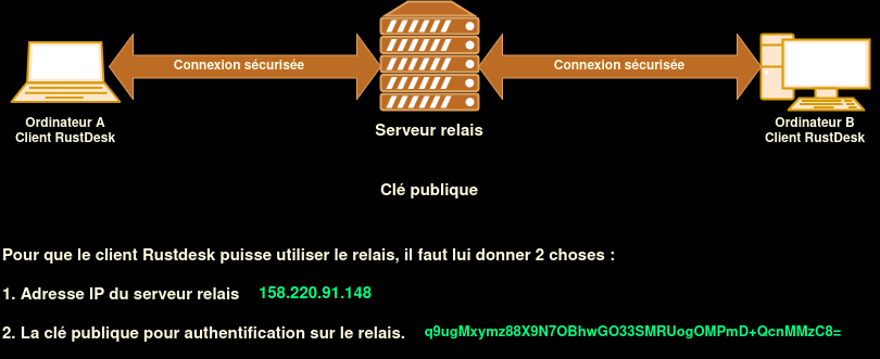 D’un point de vue réseau, la connexion n’est pas directe de “A” vers “B”. Elle passe par un ordinateur tiers qui héberge Rustdesk. On appelle cet ordinateur intermédiaire : un relais.