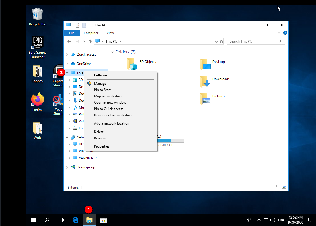 Ouvrez l’Explorateur de fichiers (1) et cliquez avec le bouton droit de la souris sur Ce PC (2) (dans le volet de gauche). Dans le menu contextuel résultant, sélectionnez Add a network location