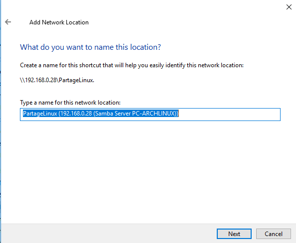 Cliquez sur Next pour continuer. Dans la fenêtre suivante, saisissez un nom pour l’emplacement du réseau. Un nom par défaut sera récupéré par le serveur Samba, vous pouvez soit l’utiliser, soit saisir un nom personnalisé qui vous permettra de vous souvenir plus facilement de l’emplacement du partage ou de ce qui y est hébergé.