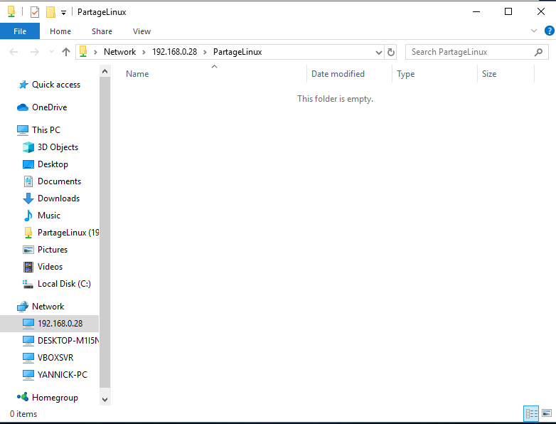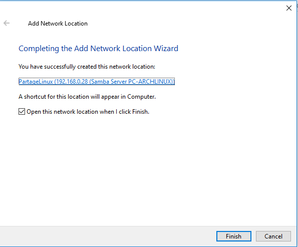 Et voilà, même pas besoin de s’identifier grâce au paramètre « guest ok » définit avec Samba. Désormais, à chaque démarrage, on aura notre dossier partagé de connecté