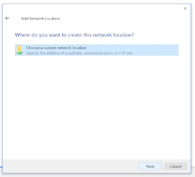 Un nouvel assistant s’ouvrira, qui vous guidera dans le processus de création d’un raccourci pour un nouvel emplacement réseau dans l’explorateur de fichiers. Cliquez sur Next dans la fenêtre de bienvenue. Dans l’écran résultant, cliquez sur Choose a custom network location (la seule option), puis cliquez sur Next.