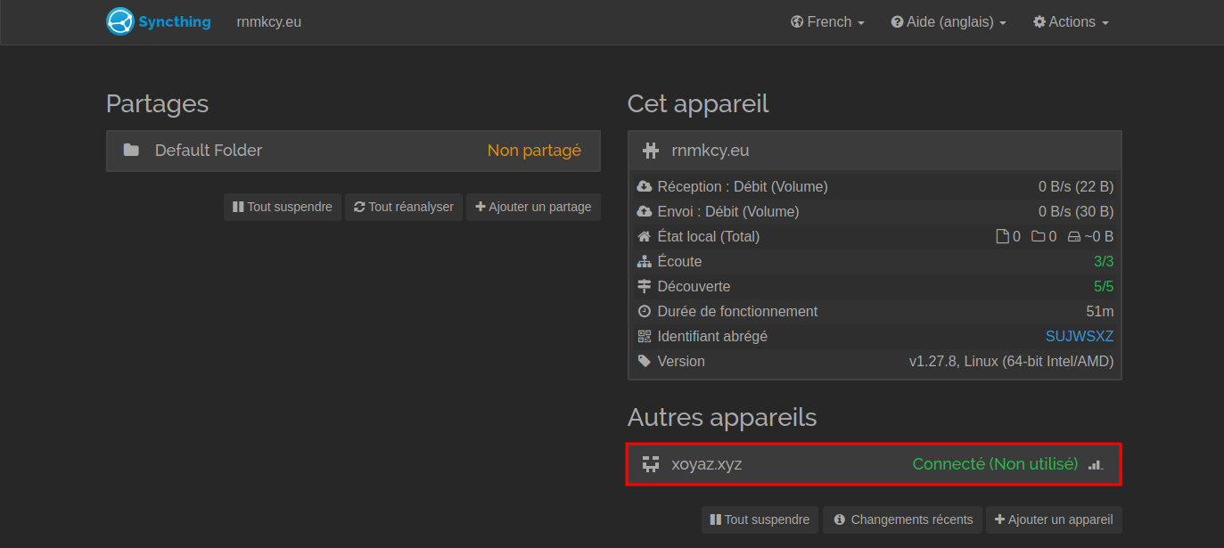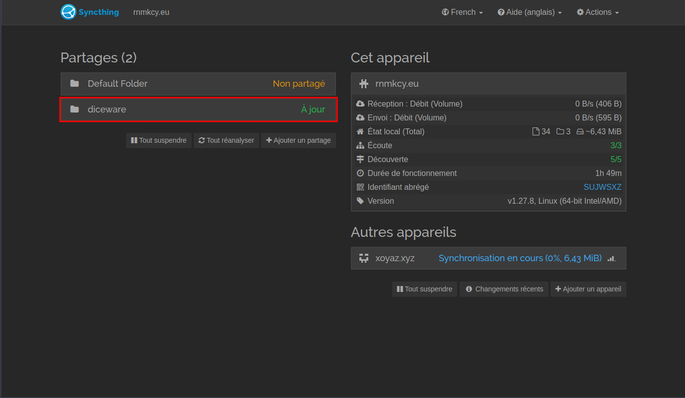 Une fois que nous avons deux appareils utilisant Syncthing, nous pouvons commencer à synchroniser les fichiers entre eux.