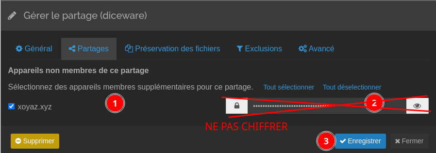 - ID du partage Identifiant unique du partage. Doit être le même sur l’ensemble des appareils concernés. N’hésitez pas à remplacer celui proposé d’office par Syncthing par un nom intelligible.