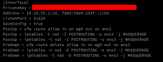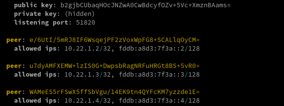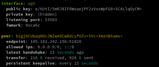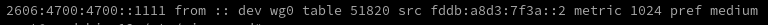 Notez à nouveau l’interface wg0 et l’adresse IPv6 fddb:a8d3:7f3a::2 que vous avez attribuée au client PEER