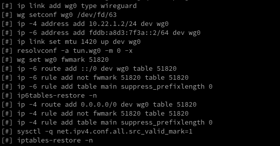 Si vous n’utilisez WireGuard que pour accéder aux ressources du VPN, substituez une adresse IPv4 ou IPv6 valide comme la passerelle elle-même dans ces commandes. Par exemple 10.22.1.1 ou fd0d:86fa:c3bc::1.
