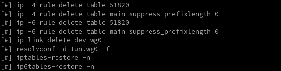 Dans le cas où vous acheminez tout le trafic à travers le VPN et que vous avez configuré la redirection DNS, vous devrez installer l’utilitaire resolvconf sur le client WireGuard Peer avant de démarrer le tunnel.