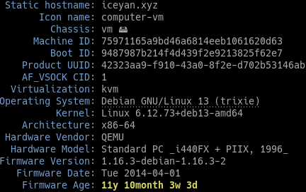 Linux iceyan.xyz 6.12.41+deb13-amd64 #1 SMP PREEMPT_DYNAMIC Debian 6.12.41-1 (2025-08-12) x86_64 GNU/Linux