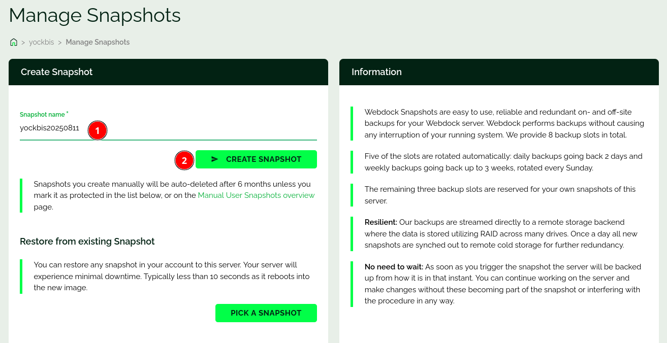 Donner un nom au snapshot: yockbis20250811 puis cliquer sur le bouton > CREATE SNAPSHOT