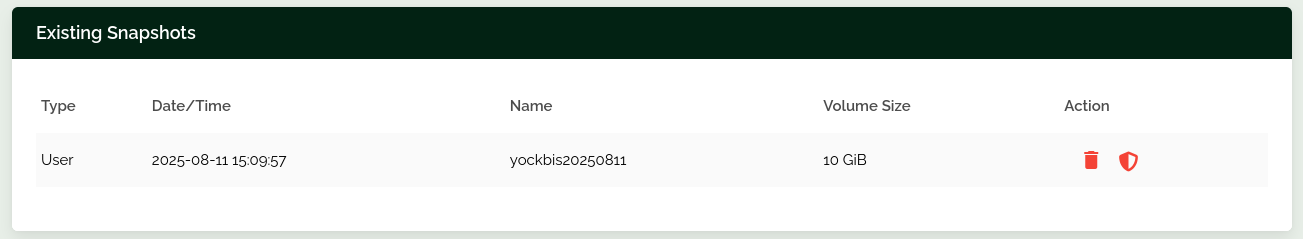 Les snapshots que vous créez manuellement seront effacés automatiquement après 6 mois à moins que vous ne le marquiez comme protégé dans la liste ci-dessous, ou sur la page Manual User Snapshots overview.