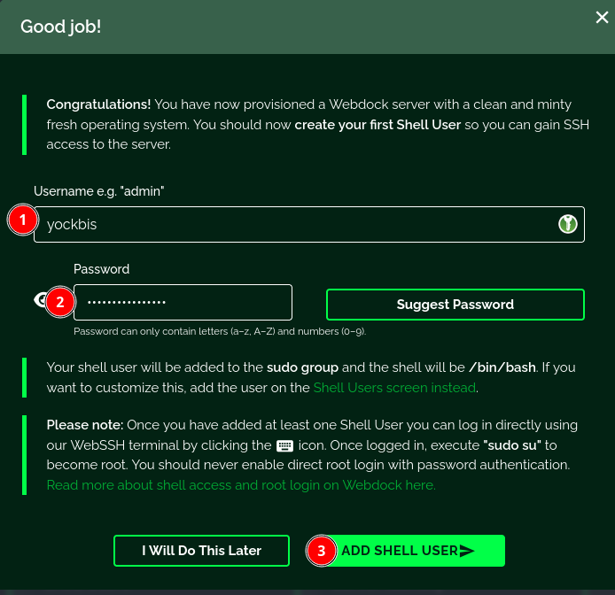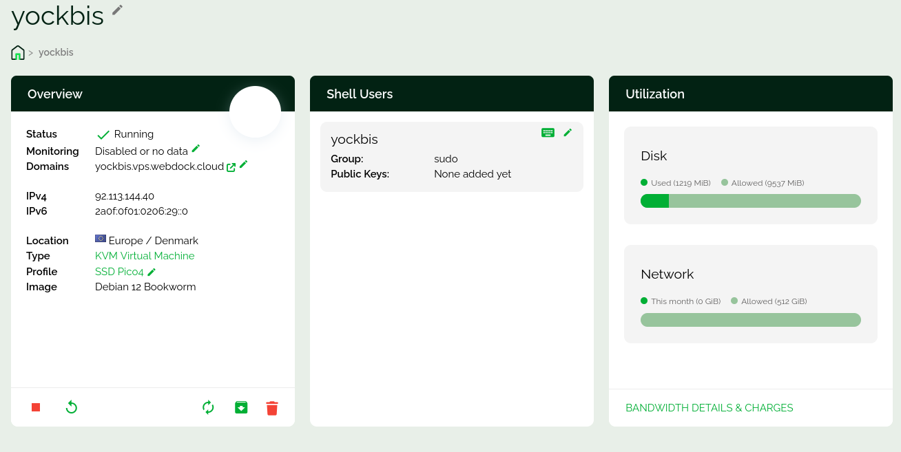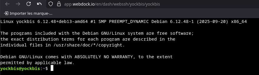 Ouverture en mode Web Terminal (https://webdock.io/en/dash/webssh/yockbis/yockbis) est dépendante du paramétrage navigateur, il peut ne pas fonctionner si la sécutité navigateur est élevée