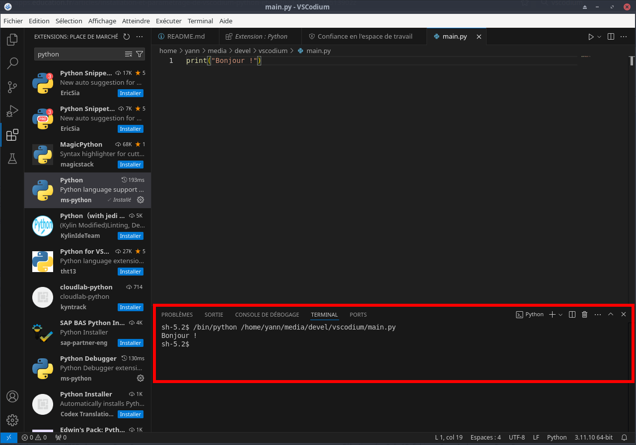 Cela devrait afficher en bas de l’écran le Terminal, avec le texte “Bonjour !”.