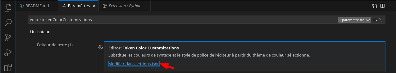 Dans la barre de recherche, cherche editor.tokenColorCustomizations