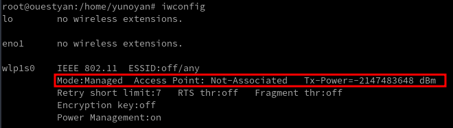 Comme vous pouvez le voir, l’interface sans fil n’est associée à aucun point d’accès pour le moment. Exécutez ensuite la commande suivante pour afficher l’interface sans fil.