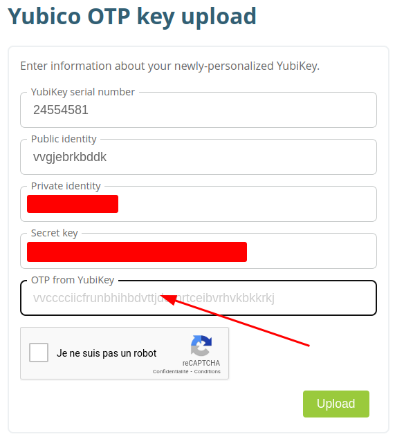 Un navigateur devrait sâouvrir et naviguer vers https://upload.yubico.com/, avec la majeure partie du formulaire rempli. - Cliquez dans le champ OTP from YubiKey
