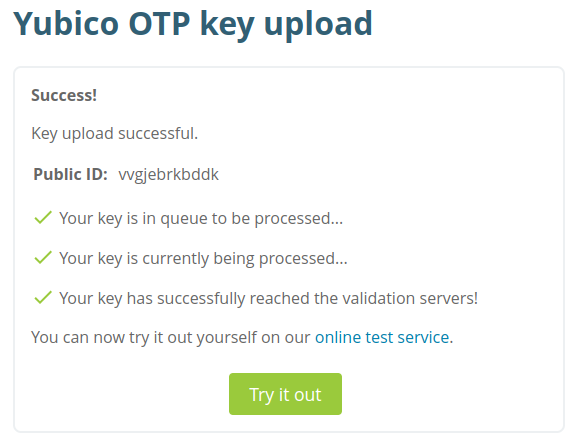 - Une fois le traitement terminĂ©, cliquez sur Try it out et suivez les instructions de la page pour tester votre justificatif dâidentitĂ©. https://demo.yubico.com/otp/verify