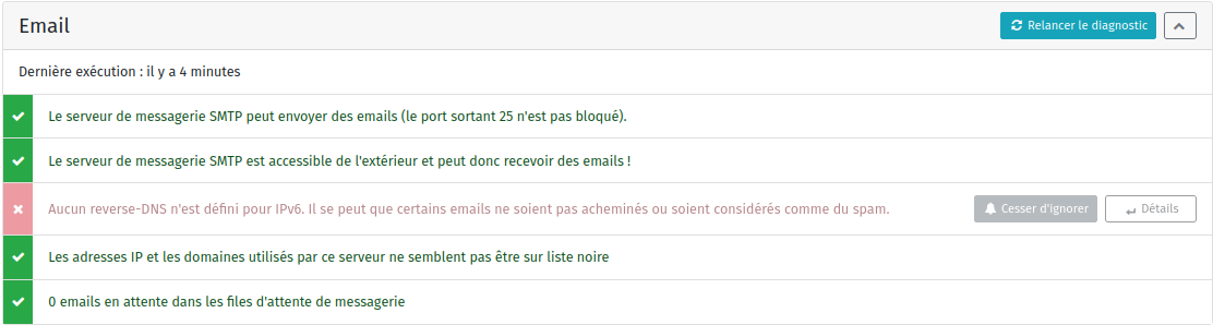 - diagnostiquer les potentiels problèmes dans la section 'Diagnostic' de l'interface web (ou 'yunohost diagnosis run' en ligne de commande) ;