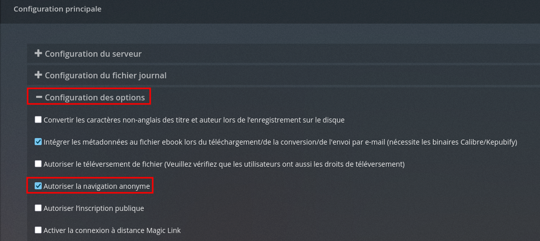 Cochez pour permettre aux utilisateurs non connectés de parcourir le catalogue, les autorisations d’utilisateur anonymes peuvent être modifiées en tant qu’administrateur (en affichant en tant qu’utilisateur “Guest” dans la section “admin” “Editer la configuration principale” et “Configuration des options”)