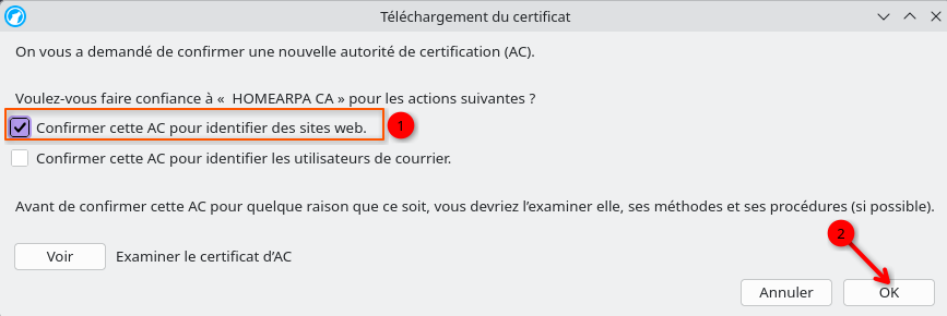 Le système d’exploitation client ou la maintenant du navigateur doit avoir le certificat de l’autorité de certification ajouté à sa liste d’autorités de certification approuvées. Les instructions varient selon le système d’exploitation et le navigateur, mais les instructions pour quelques clients majeurs sont répertoriées ici. Pour toutes ces étapes, le « certificat » auquel il est fait référence est le « homeArpaCA.crt » généré à l’étape 2.