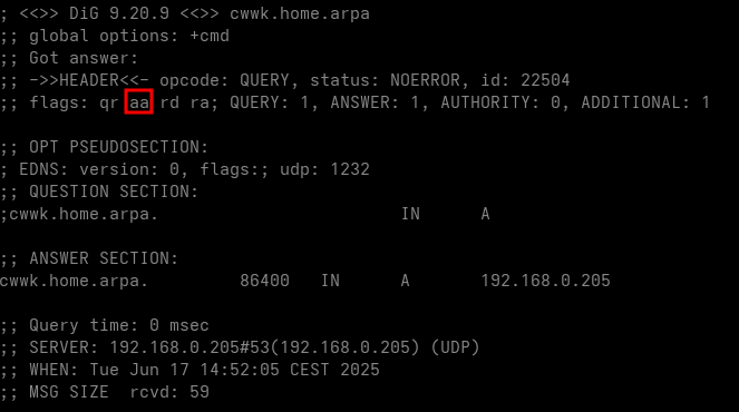 On a dans les 2 exemples précédents, l’indication aa(Authoritative Answer) dans les réponses. Le résolveur fait donc autorité et nous a bien servi les enregistrements configurés.