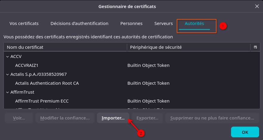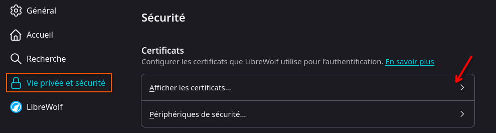 | Firefox | Firefox n’utilise pas le magasin de confiance des systèmes d’exploitation, l’autorité de certification doit donc être ajoutée manuellement. Si le certificat a une extension ‘.pem’, le moyen le plus simple est de glisser-déposer le fichier de certificat CA sur Firefox ; une prompt vous demandera de faire confiance au certificat. Sinon, ajoutez manuellement des certificats et gérez les certificats ajoutés via les préférences Confidentialité et sécurité de Firefox. Plus d’informations peuvent être trouvées sur le wiki de Firefox . |