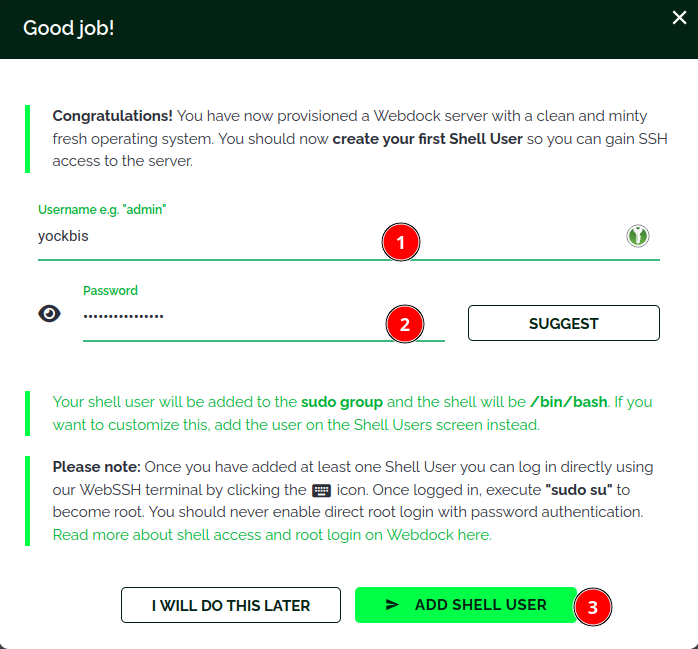 Utilisateur créé, ouvrir le shell